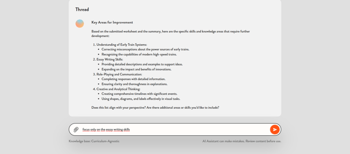 Based on the detailed performance data and the summary, the AI Assistant generates a development plan that lists the identified areas for improvement, including specific knowledge and skills. You can customise the plan by adding more details or adjusting its focus in a message for AI.