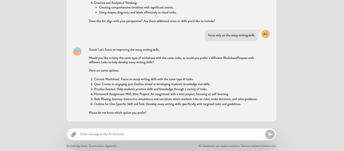 After confirming the type of worksheet, the AI assistant starts to generate a new outline for a new worksheet, tailored to the student’s strengths and weaknesses, based on the overall feedback and the student’s submission. If you want to make adjustments in this outline, feel free to customise the AI’s suggestions on the tasks!