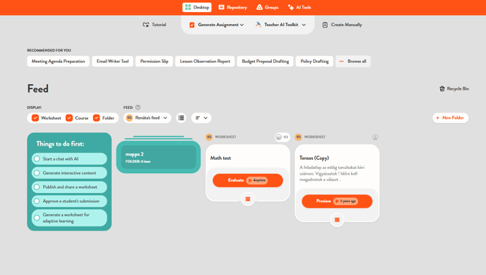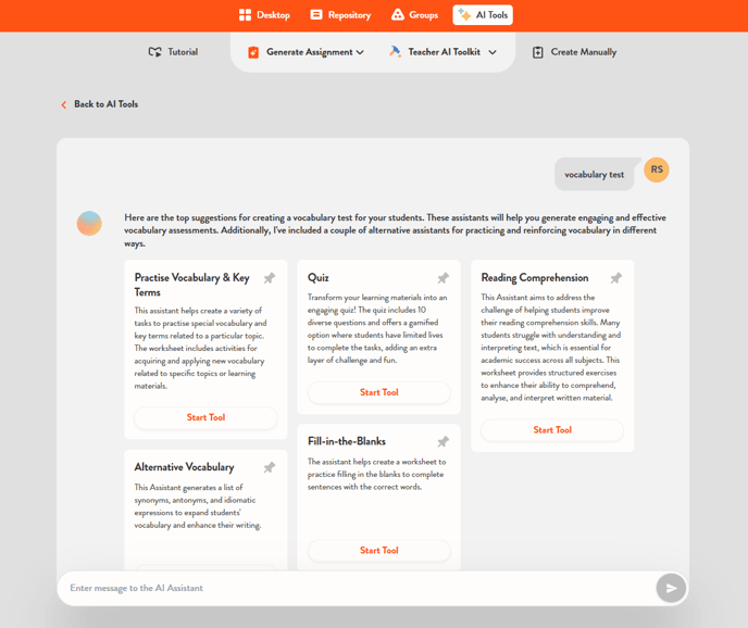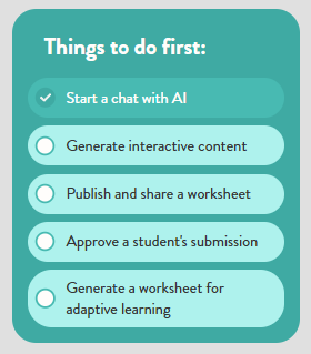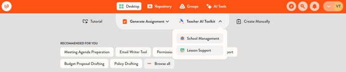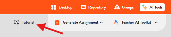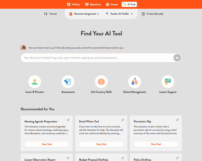 You’ll see AI Tools button in the main menu. When you click it, you'll get an overview of all the AI tools available. These tools can help you make lesson plans, assignments, and other teaching materials.