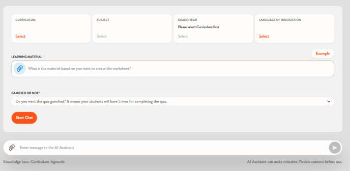 To use any AI assistant, just click Start Tool, then choose your curriculum, subject, grade, and language. You can also upload your own material or write a short description to help the AI give better results.