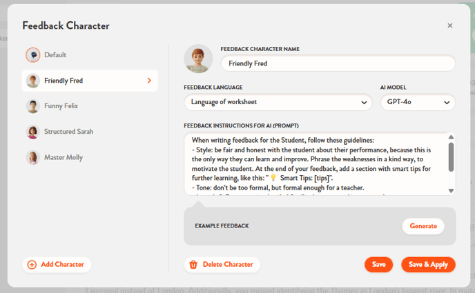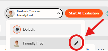 You can also edit these characters, adjusting their style, tone, length, format, and even the language of the feedback. To edit a character, just click on the pencil icon.