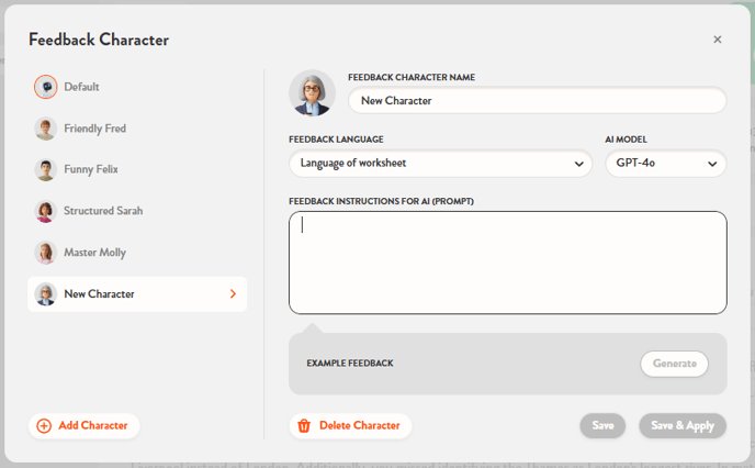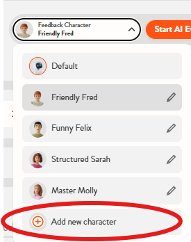 For even greater flexibility, you can create new feedback characters from scratch. This option starts as a blank template where you can define your own requirements, including style, tone, length, format, and language. To create a new character, click the Add new character button.