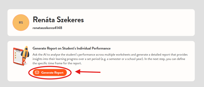 In the student profile, you’ll see all of their submitted worksheets. If you click on the student's name, you’ll also see the Generate Report button, along with a short description of what the report includes. Click on this button to get started.
