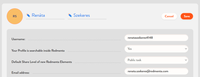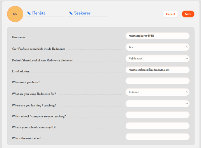 If the Save button is not active on the Edit Profile page, there are required fields that you have not yet filled in (year of birth, what you use Redmenta for, etc.). It's important to save these, because only with this information can the system proceed and save your changes.