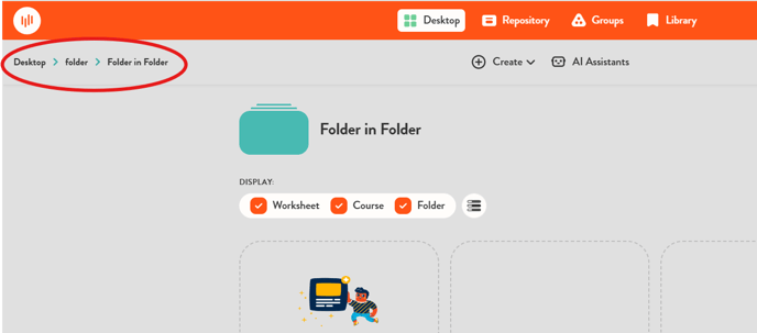 This means that if you create a new folder inside a folder, the newly created folder will be created in this folder. This makes it even easier for you to organise your worksheets and set up your folder system in the way that is most transparent to you. And in the top left-hand corner, navigation buttons will show you which folder you're in. These are clickable, so you can return to another level anytime by clicking on its name. For example, if you have a folder within a folder and a subfolder associated with it, you don't have to go back to the Desktop one step at a time; use the navigation buttons and click on Desktop to return here.
