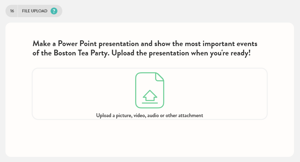 The File Upload task type allows you to upload files from your own device when completing Redmenta worksheets. The type of file can be of any type, but based on the assignment settings, your teacher can specify whether you should attach an image, video, text document or audio file.