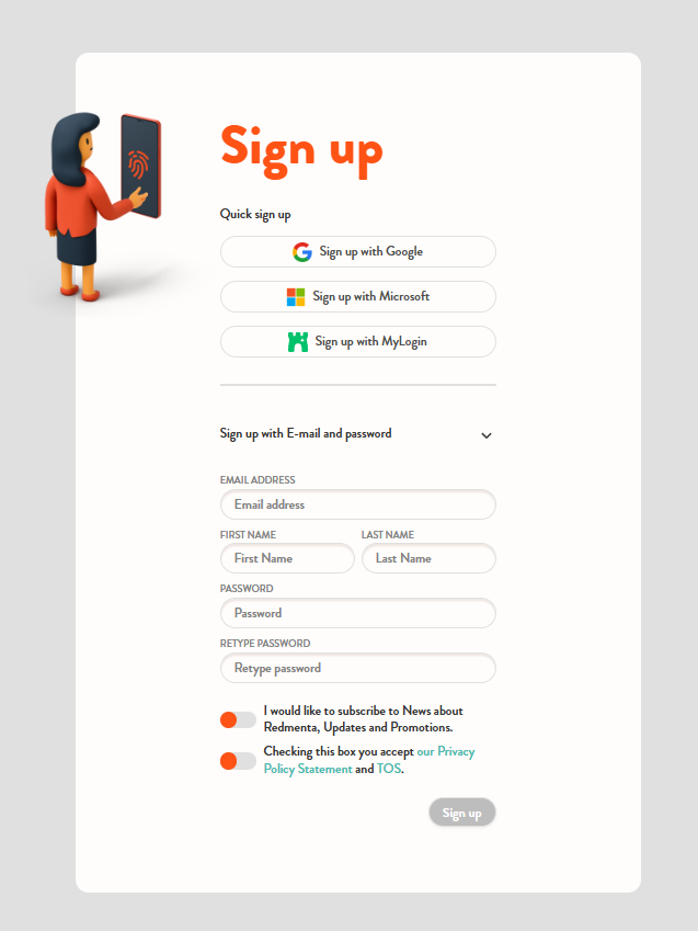 To register, click on the Sign up menu on the main site of Redmenta.com (https://redmenta.com/en/registration). To register, enter your email address, first and last name and a password. Before finalizing, please read and accept Redmenta's Privacy Policy and Terms of Use. To do this, click on the red slider which will turn green upon acceptance. You can also subscribe to the Redmenta newsletter if you don't want to miss the latest updates, methodological recommendations and other Redmenta insights.