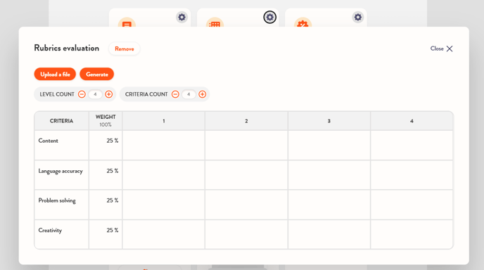 Set grading criteria to evaluate student responses. You can read more about Rubrics here and about the Percentage Evaluation settings here.