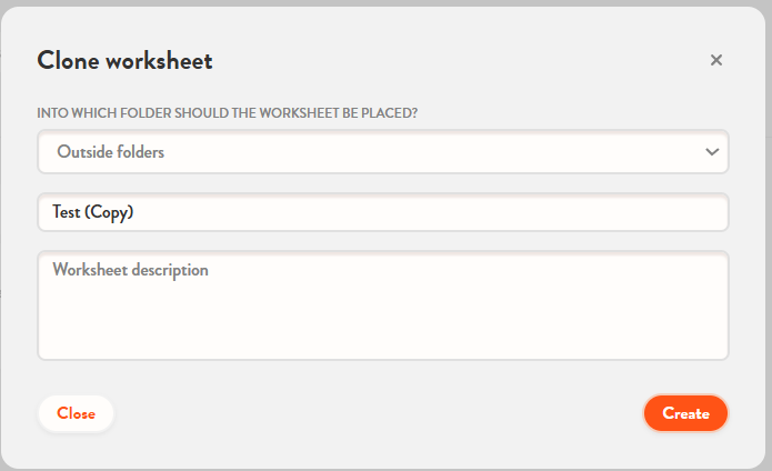 When copying, you can use the window that appears to choose which folder the cloned worksheet should go to (and with what title and description). Once these settings have been made, clicking on Create will take you to the editing interface of the copied worksheet.