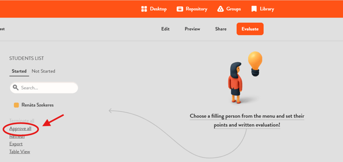 Instructor approval is required to confirm the final result, which can be done in the Evaluate menu. Before approval, you can check the answers given by the student, overview the auto-correction and AI generated feedback, or correct the given scores.