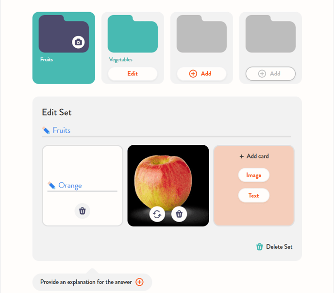 Para editar conjuntos, primero ingresa la instrucción, luego crea el primer conjunto con todas sus tarjetas relacionadas (una tarjeta puede ser un texto o una imagen). Antes de pasar a editar el siguiente conjunto, no olvides ingresar el nombre del primer conjunto. Es importante no dejar este campo vacío.