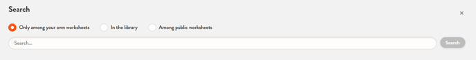 Puedes buscar hojas de trabajo públicas utilizando el cuadro de búsqueda en el encabezado, con una cuenta iniciada. Al buscar, puedes hacerlo dentro de tres grupos diferentes de hojas de trabajo. Puedes iniciar una búsqueda entre tus propias hojas de trabajo, en la Biblioteca o entre las hojas de trabajo públicas.