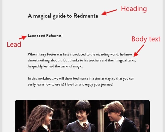 - Texto principal: la descripción puede usarse para resumir lo que necesitas saber sobre el tema. Además de una breve descripción, aquí también puedes escribir, por ejemplo, la tarea (PERO no escribas aquí el contenido textual detallado ni información relacionada con el plan de estudios; para eso necesitarás el elemento "Cuadro de contenido").