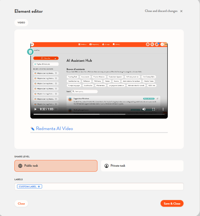 Usa el elemento de hoja de trabajo de video para compartir tus videos en el material. Te mostramos cómo.