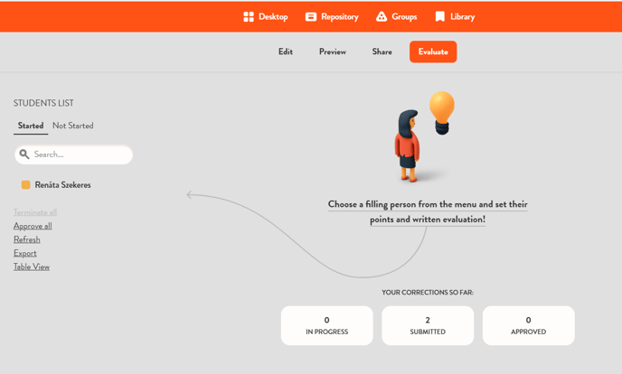En el menú Evaluar, también puedes ingresar la aprobación del instructor para finalizar los resultados. Con la aprobación del instructor, puedes indicar a la persona que completó la hoja de trabajo que el resultado es definitivo y a ti mismo que no hay nada más que hacer con él (esto se indicará mediante códigos de colores, con un recuadro verde junto a las hojas de trabajo aprobadas en la lista de finalizaciones).