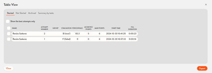 Si deseas ver todos los datos de la finalización en un solo lugar, haz clic en el botón Vista de tabla a la izquierda. De esta manera, no tienes que hacer clic en cada participante para obtener los datos correspondientes, sino que puedes verlos en formato de tabla.