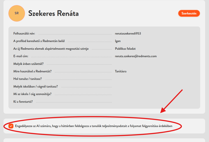 Az automatikus AI értékelést a Profil szerkesztése menüpontban tudod engedélyezni. Ha ezt bejelölöd, akkor ezentúl amint egy diák beküldi a feladatlapját, az AI értékelés automatikusan lefut a háttérben.