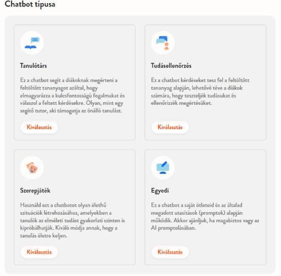 Jelenleg négy különböző chatbot típus közül választhatsz – mindegyik egy-egy meghatározott tanulási célra készült: