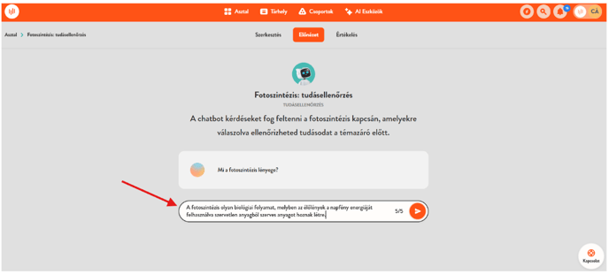 - Tudásellenőrzés: Ezt a chatbotot akkor ajánljuk, ha amikor a tanulók megértésének ellenőrzése a cél. Az AI feltöltött anyagaidból tesz fel ellenőrző kérdéseket a diáknak, amire neki választ kell adnia. Az AI azonnal reagál a válaszra, visszajelzést ad, és el is magyarázza, miért jó (vagy nem jó) az adott válasz. Ideális tanulási szakaszok közben (a vége felé közeledve) formatív értékelési lehetőségként, amely segíthet a tanulási út további tervezésében.