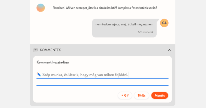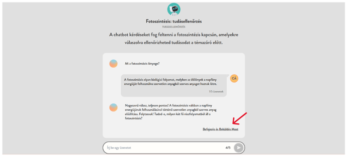 A beszélgetést befejezését követően a "Befejezés és beadás most" gombra kattintva a tanuló elküldheti neked a végleges (befejezett) beszélgetést. Amennyiben a tanuló összes üzenete elfogy, úgy ez a művelet automatikusan megtörténik.