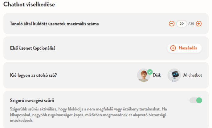 - Tanuló által küldött üzenetek maximális száma: Beállíthatod, hogy hány üzenetet küldhet el a diák a beszélgetés során.
