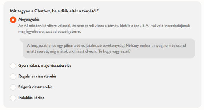 Mit tegyen a Chatbot, ha a diák eltér a témától? Azt is személyre szabhatod, hogyan reagáljon az AI akkor, ha a tanuló eltér a témától, és nem arról beszél, amiről kellene. Erre különböző opciókat kínálunk, mindegyiket rövid leírással és AI által küldött példareakciókkal, hogy segítse a döntést a tanulási célnak megfelelően.