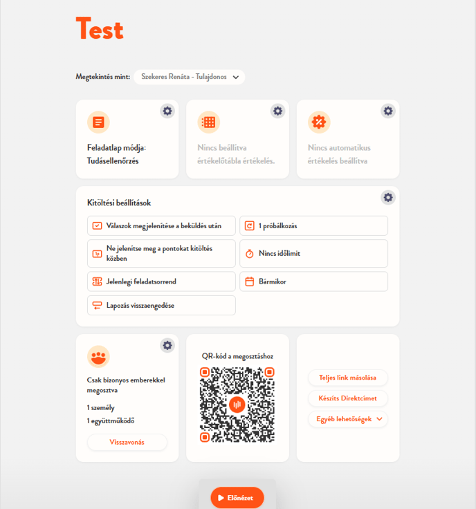 Az Előnézeti oldalon több személyre szabási lehetőséget találsz a beállítások ikonokra kattintva. Ezek a beállítások lehetővé teszik, hogy szabályozd, hogyan működik a feladatlap a diákok számára.