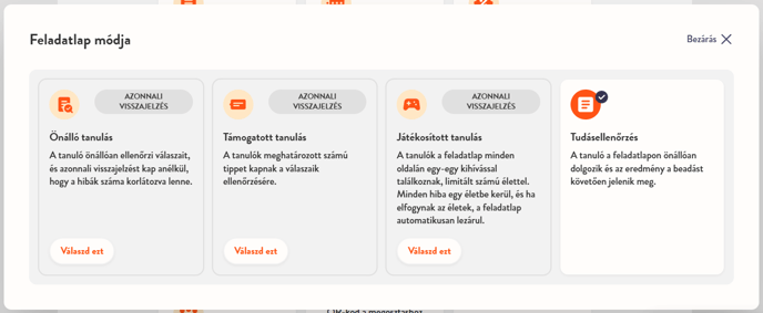 Feladatlap módja – Kiválaszthatod, hogyan kapjanak a diákok visszajelzést a teljesítményükről (például azonnal vagy játékos formában). A feladatlap módjairól itt olvashatsz bővebben!