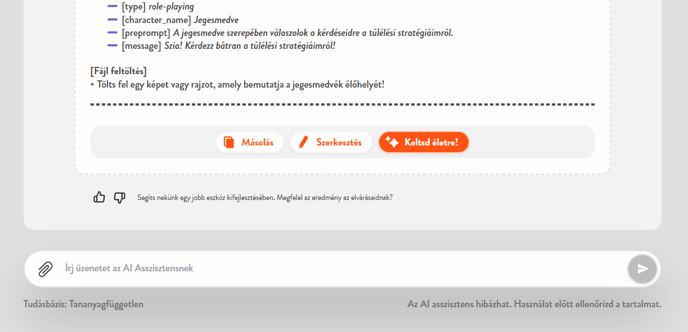 Ne feledd, hogy a vázlat még nem a végleges variáns! Ahogy az AI Asszisztens funkcióknál, itt is lehetőséged van módosítani a létrehozott feladatlap vázlatot, ha szükséges. Módosíthatod a kérdéseket, újakat adhatsz hozzá, vagy beállíthatod a nehézségi szintet - amit csak szeretnél. Kéréseidet üzenet formájában tudod elküldeni az asszisztensnek. Törekedj a minél pontosabb megfogalmazásra a változtatásokat illetően.
