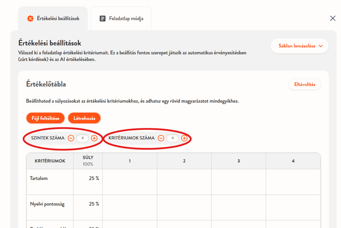 Nyisd meg a Szerkesztés menüt egy feladatlapon, ezután kattints az Értékelési beállítások lehetőségre, ahol hozzáadhatod az Értékelőtáblát a feladatlaphoz. Egy alapértelmezett szempontrendszert fogsz látni, de teljes mértékben testre szabhatod, beleértve a szintek és kritériumok számának módosítását is. Az értékelési szempontrendszer minden részét szerkesztheted és kiegészítheted a megfelelő részekre kattintva. Vagyis az alapértelmezett kritériumok (tartalom, pontosság stb.) NEM véglegesek, ezeket kattintással azonnal szerkesztheted!