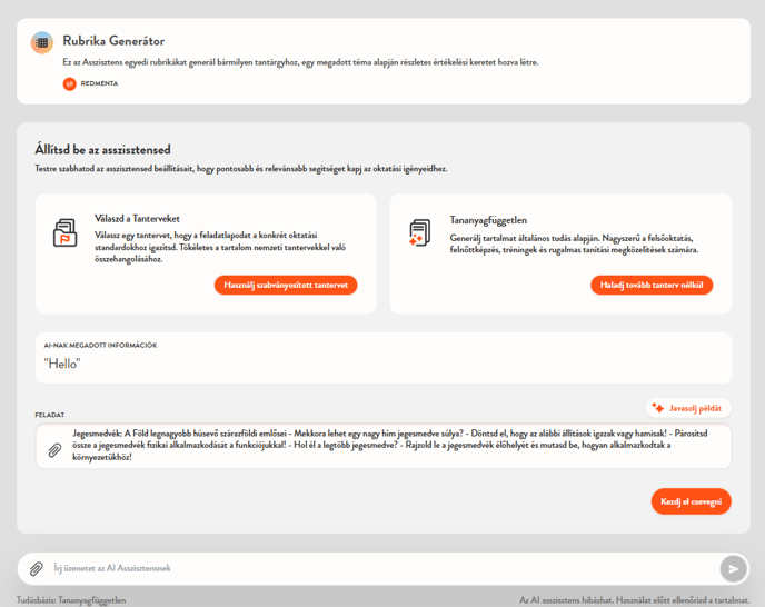 Értékelőtáblát az AI segítségével is létrehozhatsz egyet a Létrehozás gombra kattintva. A Rubrika Generátor oldalon kattints a Kezdj el csevegni gombra az értékelési szempontrendszer elkészítéséhez.