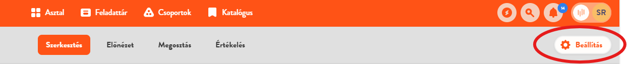 Ha pedig a feladatlap valamelyik oldalán van (Szerkesztés, Megosztás, Előnézet, Értékelés), akkor a Beállítás menüt az oldal tetején, jobb oldalt találod.