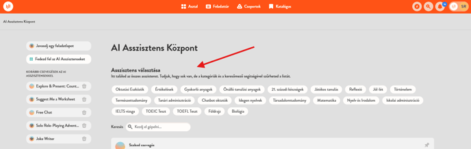 Az AI Asszisztens Központban különböző kategóriák között böngészhetsz, mint például tantárgyak, tanítási célok, készségek vagy feladatok. Egy kategória felfedezéséhez egyszerűen kattints rá, és az adott kategóriához tartozó asszisztensek fognak megjelenni.