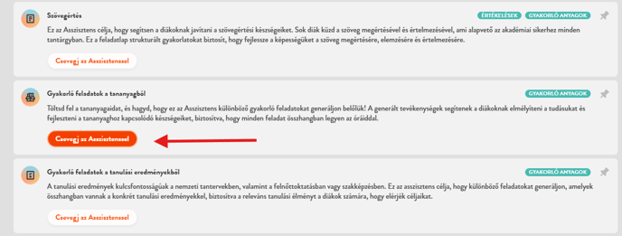 Válaszd ki azt az asszisztenst, amely a legjobban illik a tanítási célodhoz: ezt úgy teheted meg, hogy rákattintasz a "Csevegj az Asszisztenssel" gombra, és átirányít arra a felületre, ahol megadhatod az AI számára a szükséges információkat.