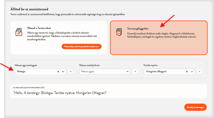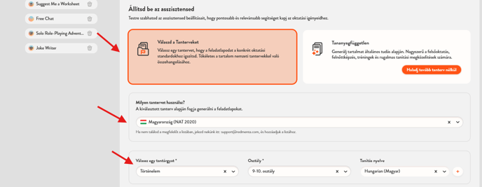 Miután kiválasztottál egy asszisztenst, tovább személyre szabhatod annak beállításait, ha kiválasztasz egy specifikus tantervet. Ezt akkor javasoljuk, ha szeretnéd, hogy a generált feladatlap megfeleljen a nemzeti tantervnek. Kiválaszthatod az országod, a tantárgyad, évfolyamot és az oktatás nyelvét.