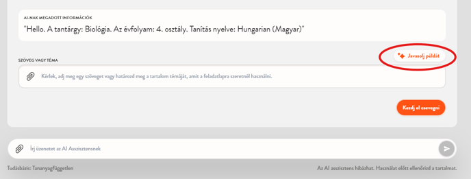Ezután megadhatod az asszisztens számára szükséges egyedi információkat a megjelenített mezőkben, például tananyagokat vagy a feladatok nehézségi szintjét. Ezek az információk asszisztensenként eltérőek, attól függően, hogy milyen típusú feladatlapot segítenek létrehozni. Ha nem vagy biztos abban, hogy mit kell megadnod, egyszerűen kattints a Javasolj Példát gombra példákért.