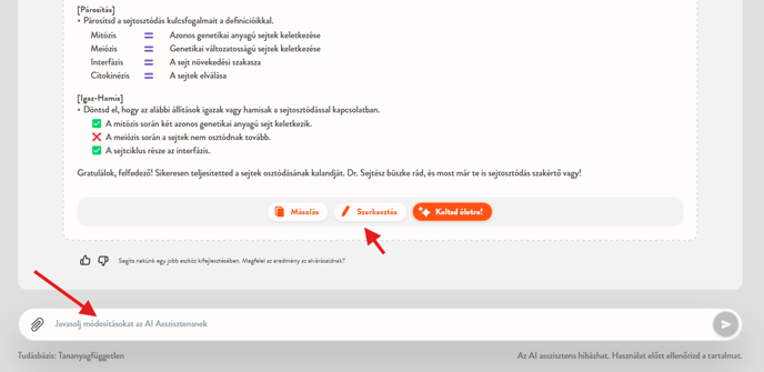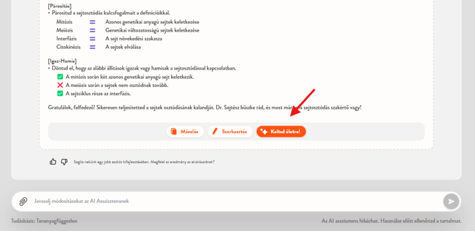 Az AI asszisztens egy vázlatot fog generálni. Ne feledd, hogy a vázlat csupán egy tervezet! Tovább finomíthatod azt az asszisztenssel folytatott beszélgetés során: például kérhetsz más típusú feladatokat vagy egy nehezebb változatot. A vázlatot manuálisan is szerkesztheted a Szerkesztés gombra kattintva.