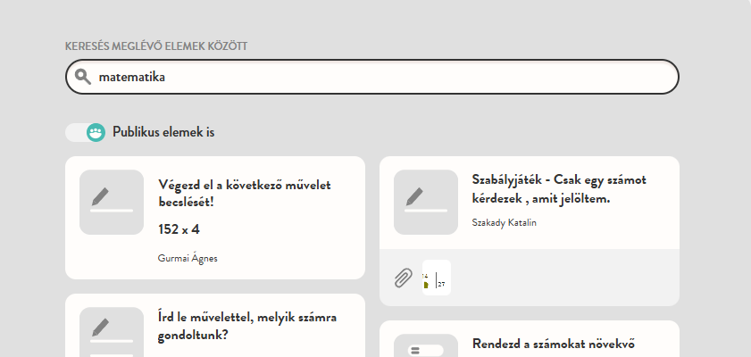 Ha egy már meglévő feladatot szeretnél a feladatlapba helyezni, az eszköztár alatt találod a feladatkeresőt. A keresőbe írd be a keresett feladat kulcsszavait, illetve válaszd ki, hogy saját vagy publikus feladatok közül válogatsz (a publikus feladatok között a sajátjaid is megjelennek, de ezeket csak te láthatod).