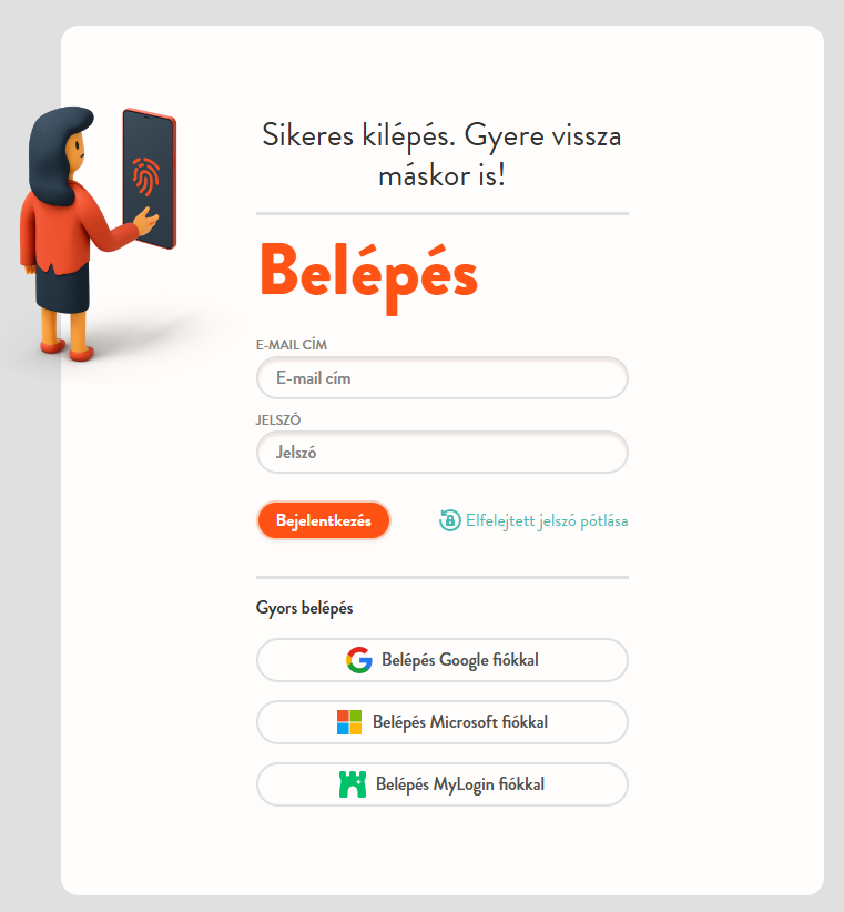 A belépéshez add meg a regisztrált email címed és a jelszavad. Ha a gyors belépést választod, válaszd ki a megfelelő Google vagy Microsoft fiókodat. Figyelj arra, hogy ha másik email címmel regisztráltál, mint amihez a Google/Microsoft/MyLogin fiókod tartozik, akkor nem a korábban regisztrált fiókba fogsz belépni, hanem egy újonnan létrehozott fiókba! Mindig ügyelj, hogy a gyors belépésnél a korábban regisztrált Google, Microsoft vagy MyLogin fiókodat válaszd ki.