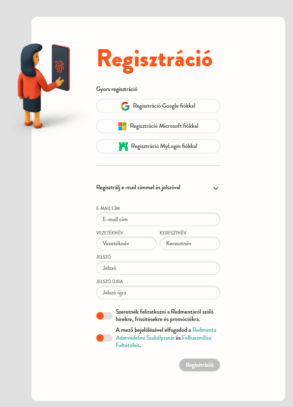 Amennyiben szeretnél regisztrálni, kattints a Redmenta.com főoldalán található regisztrációs menüre (https://redmenta.com/hu/registration). A regisztrációhoz add meg az e-mail címed, vezeték- és keresztneved, illetve adj meg egy jelszót is. A véglegesítés előtt olvasd át és fogadd el a Redmenta Adatvédelmi Szabályzatát és Felhasználási Feltételeit. Ehhez kattints a piros csúszkára, ami zöldre vált az elfogadáskor. Ugyanígy tudsz feliratkozni a Redmenta hírlevélre is, ha nem szeretnél lemaradni a legfrissebb fejlesztésekről, módszertani ajánlásokról, és egyéb Redmenta tippekről.