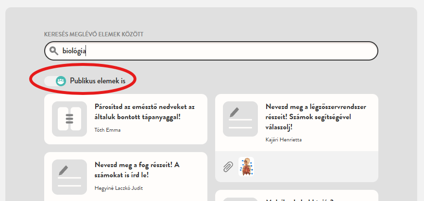 A feladatlap-szerkesztő alján található keresővel tudsz válogatni a saját, illetve a publikus feladatok közül, amit aztán bemásolhatsz az aktuálisan szerkesztett feladatlapba.