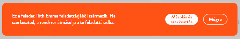 A feladatmásolással sok időt megspórolhatsz, és a publikus feladatok által rengeteg feladat közül válogathatsz. Azt azonban érdemes szem előtt tartani, hogy a lemásolt publikus feladatok tartalmazhatnak hibákat, és nincsenek automatikusan testre szabva. Így ajánlott a másolt feladatok megoldásának ellenőrzése, és a beállítások - szükség szerinti - módosítása (pl. pontozási beállítások átállítása). Ahhoz, hogy ezek a beállítások és a megoldások is megjelenjenek, mindenképp kattints a Másolás és szerkesztés gombra!