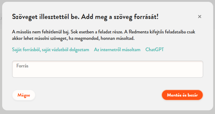 A Kifejtős feladattípus megoldásához olvasd el figyelmesen az instrukciót és fejtsd ki a választ írásban. Figyelj a szólimitre is és ha külső forrásból dolgoztál, add meg a forrást is!A szólimitet a beviteli mező jobb alsó sarkában tudod ellenőrizni, a forrást pedig a mező alatt tudod megadni a Forrás hozzáadása gombra kattintva. Itt három lehetőség közül tudsz választani (Saját forrásból, saját vázlatból dolgoztam; Az internetről másoltam; ChatGPT), de a szövegmezőbe akár saját szavakkal is megfogalmazhatod a forrás típusát, vagy linkeket is beilleszthetsz ide.