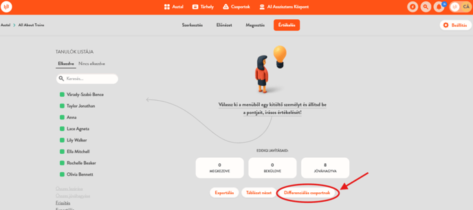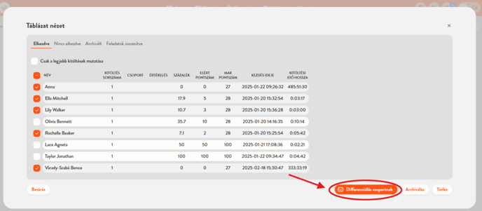 Miután kiválasztottad az összes diákot, akiket szeretnél bevonni, kattints a jobb alsó sarokban található „Differenciálás csoportnak” gombra.