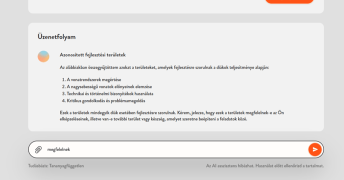 Miután kiválasztottad a feladatlap típusát, az AI Asszisztens elkezdi összeállítani az új feladatlap vázlatát, amelyet a csoport erősségeihez és gyengeségeihez igazít a beküldött munkák és a visszajelzések alapján. Ha szeretnél változtatni a vázlaton, bátran módosítsd a mesterséges intelligencia javaslatait a feladatokon!