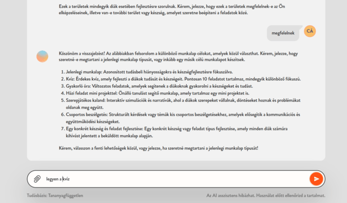 Miután jóváhagytad a fejlesztési tervet, az AI Asszisztens különböző feladatlap-típusokat ajánl a gyakorláshoz. Meghagyhatod az eredeti feladatlapot, de választhatsz valami teljesen mást is, például csoportos megbeszélést vagy szerepjátékos kalandot.