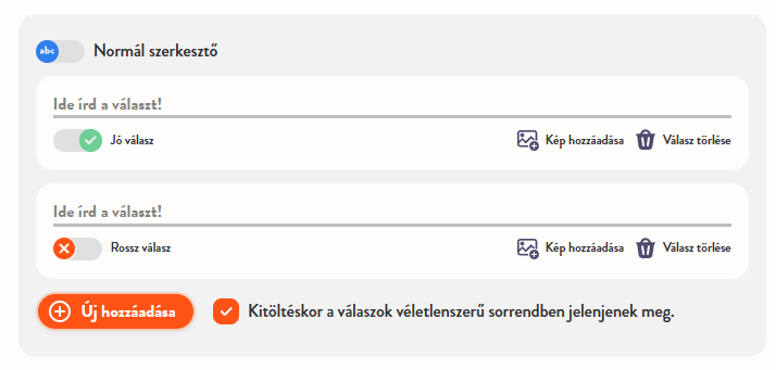 Beállíthatod továbbá, hogy a megadott válaszlehetőségek a szerkesztéskor felállított sorrendben vagy véletlenszerű sorrendben jelenjenek-e meg a kitöltéskor. Alapértelmezetten a válaszok véletlenszerűen jelennek meg. Ezt a válaszok alatt elhelyezkedő pipára kattintva állíthatod át kötött sorrendre.