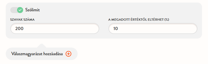 A szerkesztéskor add meg a feladat instrukcióját, a szólimitet, és ha szükséges, tölts fel csatolmányokat, írj válaszmagyarázatot.