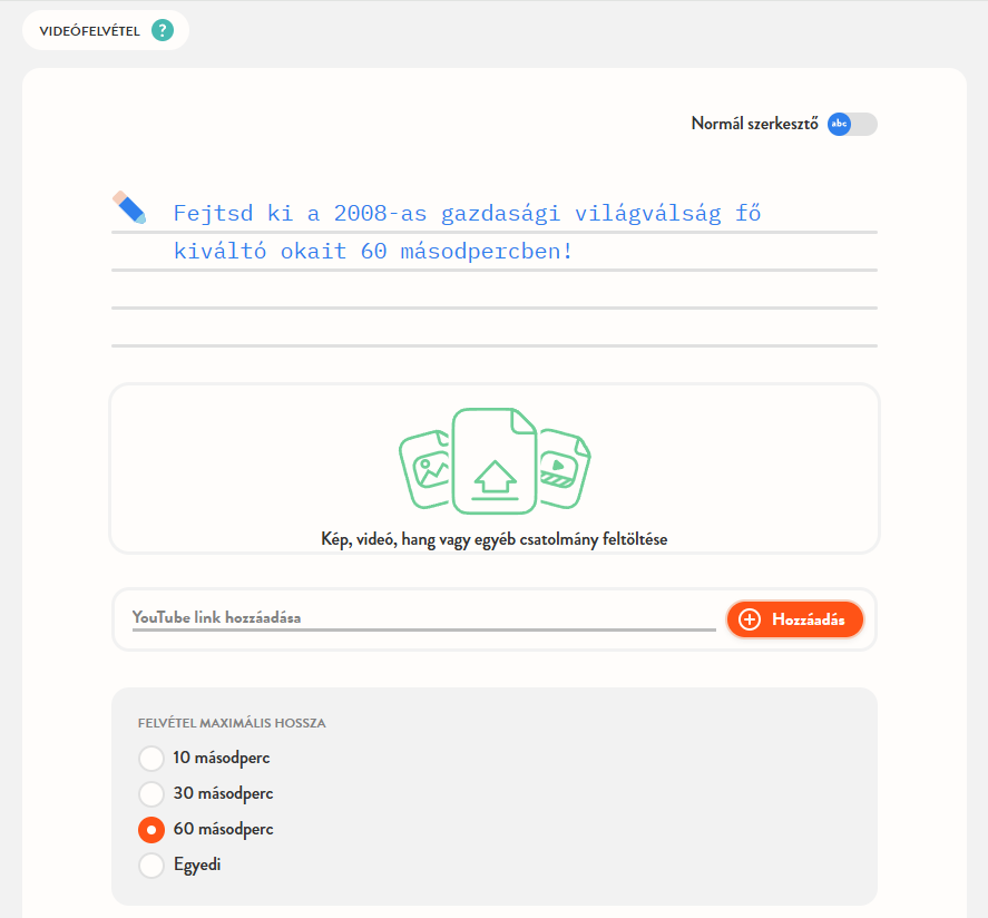 A felvétel 10-30-60 másodperces lehet. A szerkesztéskor a videó hossza mellett határozd meg a feladat instrukcióját, majd mentsd a feladatot!
