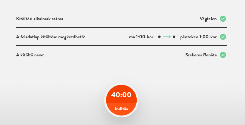 Ha az Indítás gombnál nem látod, hogy mennyi időd van kitölteni a feladatlapot, akkor a megoldáshoz nem tartozik időkorlát.